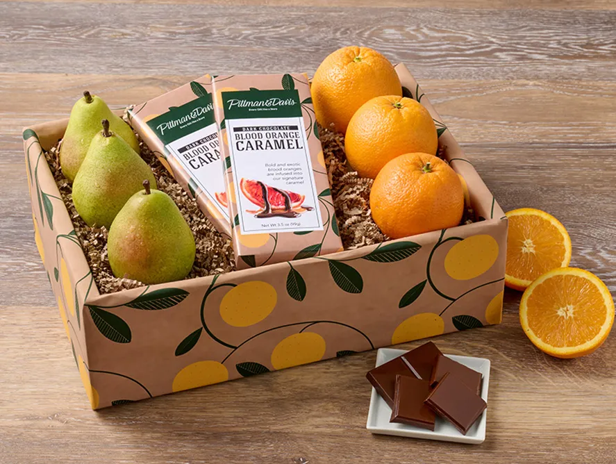 Decadent Dark Chocolate Blood Orange Caramel Bars, sugar-sweet King Comice Pears and juicy Navel Oranges make a triple treat you won’t be able to resist. Everyone on your gift list will love this unbeatable combination.
