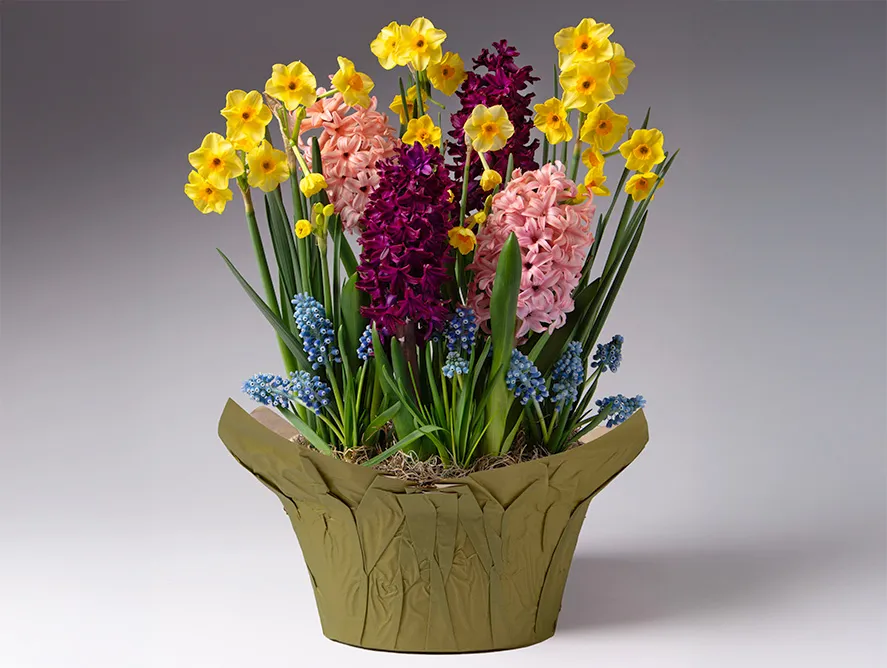 Delight recipients with this vibrant bulb garden. Two dark pink and two light pink hyacinths fill the air with fragrance, while five cheerful blue muscari add a playful touch. Four sunny daffodils complete the mix, creating a colorful, easy-to-grow gift that brightens any room.