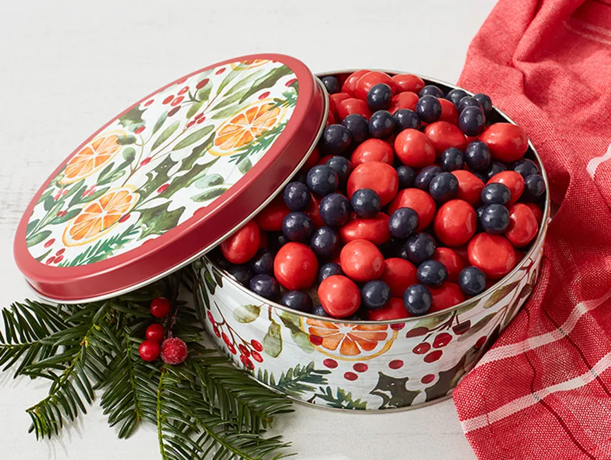 The healthful, natural flavor of real fruit shines through each delicious chocolate morsel. Arrives in a gold gift tin and makes a stunning presentation on a buffet table.