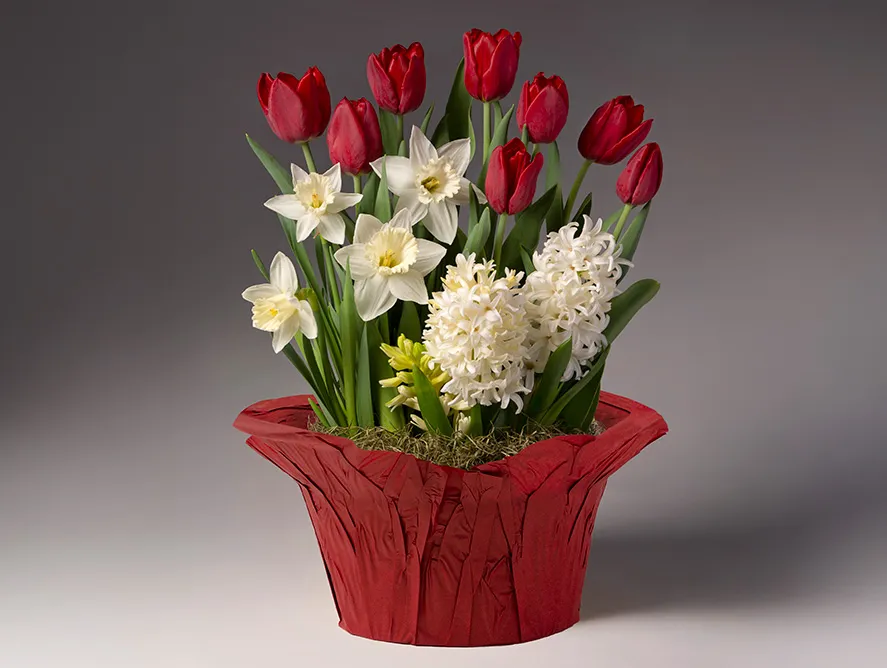 Pre-planted bulbs make a wonderful gift or holiday accent…add water and watch scarlet tulips, pale daffodils and fragrant, snowy hyacinths emerge as bright and beautiful as a fresh winter morning.