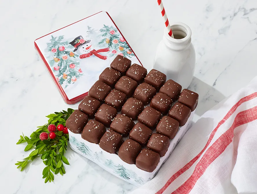Our Dark Chocolate Sea Salt Caramels are an irresistible alternative to ordinary chocolates. A sprinkling of savory sea salt complements the rich, creamy sweetness of the vanilla caramel and adds texture to the luscious dark chocolate. These sweet-and-salty morsels won’t last long, but our exclusive keepsake Snowman Gift Tin will remind them of your thoughtfulness for many seasons.