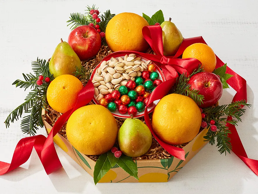 Gathered here, in festive wreath packaging, are some of our holiday favorites. Although each is special on its own, some magic happens when these treasures come together. Three super sweet Rio Ruby™ Red Grapefruit, two juicy Navel Oranges, two crisp Fuji Apples, and three King Comice Pears surround decadent Foil-Wrapped Milk Chocolate Balls and crunchy Roasted & Salted Pistachios. As beautiful as it is delicious, this gift makes a lovely holiday display.