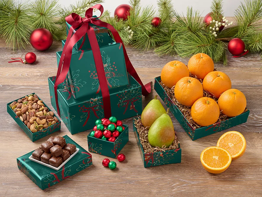 What’s more exciting than a lovely gift topped with a bow? How about a stack of lovely gifts! Five gift boxes in our exclusive holiday design each hide a tasty surprise to ensure there’s something for everyone: juicy, seedless Navel Oranges, sweet, mild King Comice Pears, decadent Dark Chocolate Sea Salt Caramels, crunchy, savory Deluxe Mixed Nuts and festive Foil-Wrapped Milk Chocolate Balls. Artfully arranged and finished with a red satin ribbon, this tower of treats is sure to surprise and delight.
