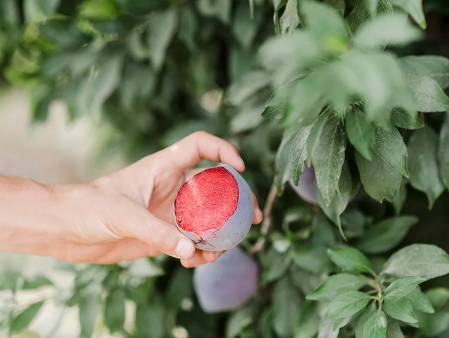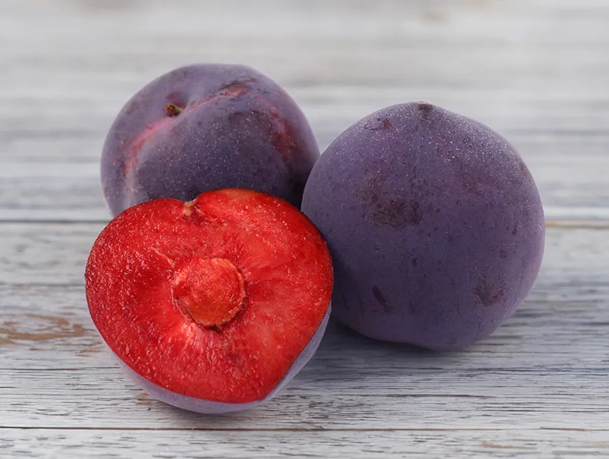 - An apricot/plum hybrid with velvety purple skin and deep red flesh