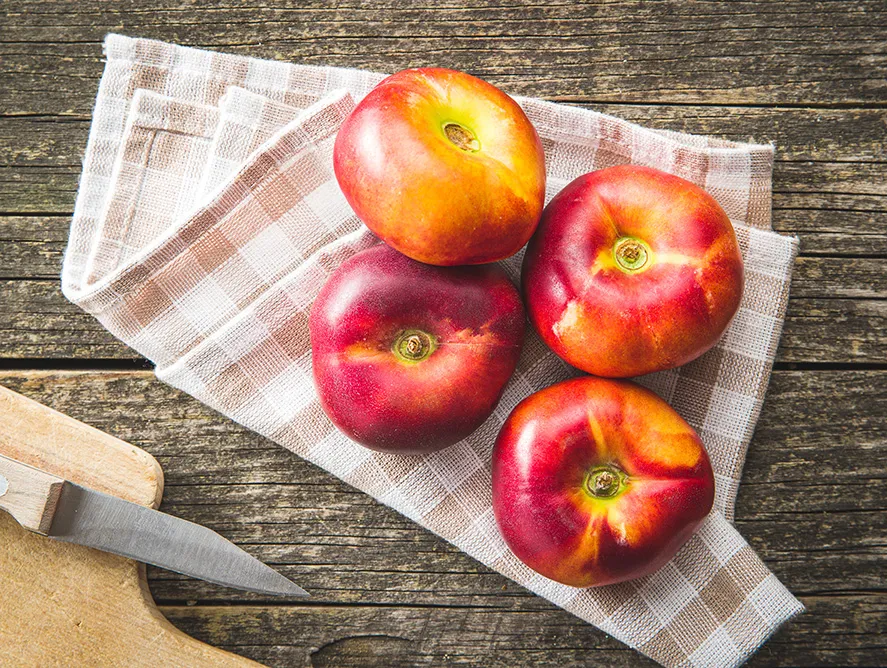 Small, ring-shaped and oh-so-sweet, it’s easy to see how mini donuts inspired this delightful flat nectarine’s name. Necta-Pie Donuts have a tender golden flesh that’s sweet enough to allow this unique stone fruit to serve as a satisfying dessert, yet with a touch of citrusy tanginess that makes it a perfectly refreshing (and very nutritious) summer snack.