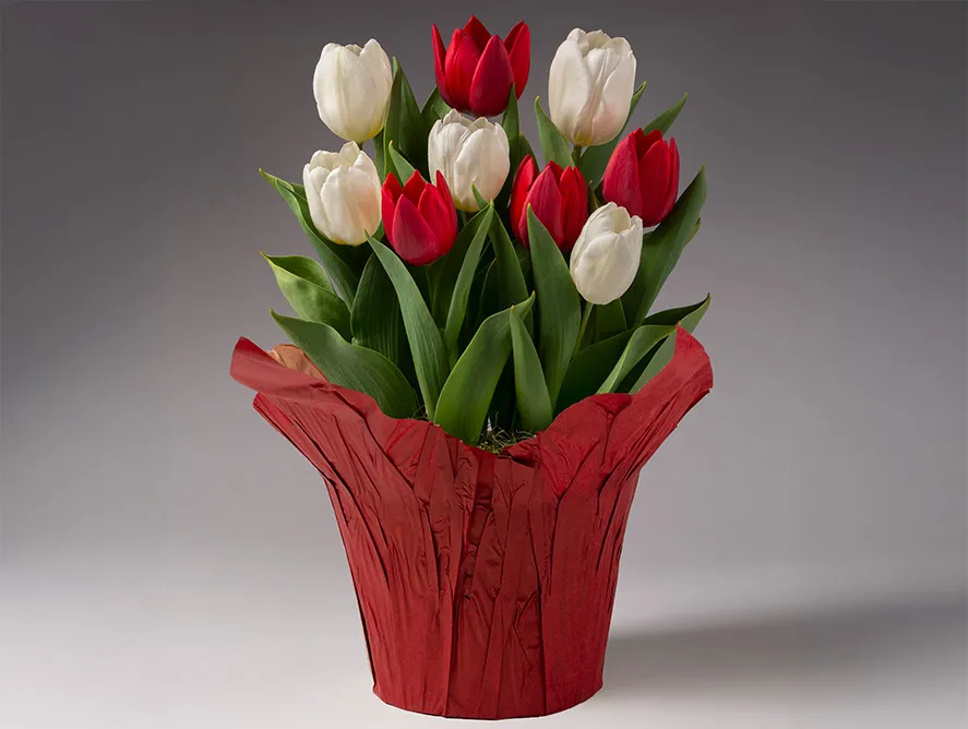 Classic, cheerful, and full of charm—this Red & White Tulip Assortment brings a timeless burst of color to any home. The vibrant scarlet blooms paired with crisp white petals create a striking display that brightens any room with elegance and joy. Easy to grow and long-lasting.