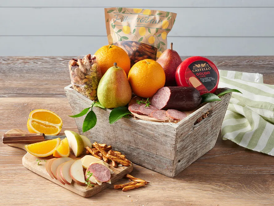Just right for the entertainer, this gift basket delivers several savory delights. Inside our reusable, rustic wood basket is an assortment of our premium citrus and orchard fruits (Navel Oranges, a Starkrimson Pear, and a King Comice Pear) along with our savory Apple Smoked Sausage, Gouda Cheese, Butter Braided Pretzels, and our exclusive American Grown Snack Mix. A mouthwatering addition to any holiday spread.