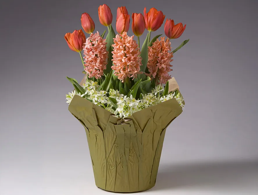 Your recipients will turn pink with pleasure when they receive this pre-planted bulb garden. In just a few weeks a variety of rosy hues emerges…fragrant hyacinths and elegant tulips in varying shades of pink arch beautifully over snowy, petite balansae in a delightful arrangement. Longer lasting than cut flowers that are here today and fade tomorrow, this gift breathes life into indoor surroundings.