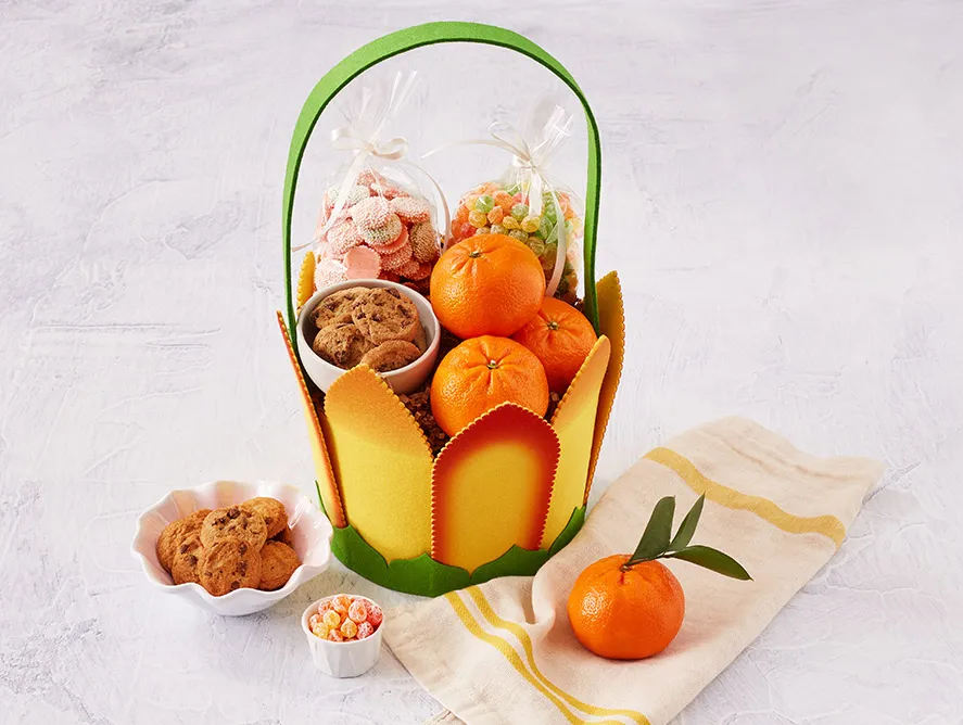 An ideal gift for any spring event, this spring-themed tote is packed with the season’s most tempting goodies. Inside a reusable, tulip-shaped felt tote are three of our juicy, seedless Clementines, sized just right for a quick snack. You’ll also find gourmet Chocolate Chip Cookies, vibrant Citrus-Flavored Hard Candies and Spring Pastel Mint Nonpareils. A fun change of pace to a traditional Easter basket!