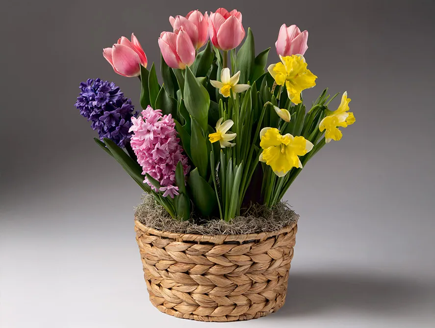 Start spring early for yourself or someone else with this lovely bulb garden. Inside a keepsake woven basket is just under a dozen of spring's most popular bulbs: tulips, hyacinths and daffodils. Instead of cut flowers which are here today and wilted tomorrow, these bulbs bloom over a period of just a few weeks into brilliant pink, purple and golden blossoms.
