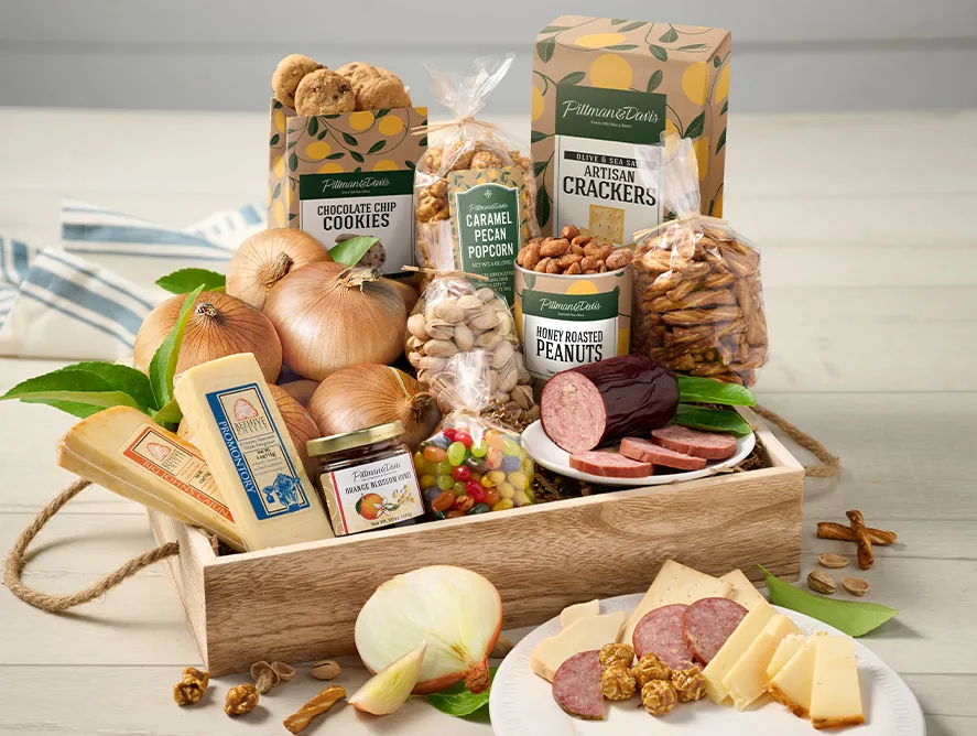 - Handsome gift assortment loaded with big, sweet onions, savory treats and tantalizing sweets
